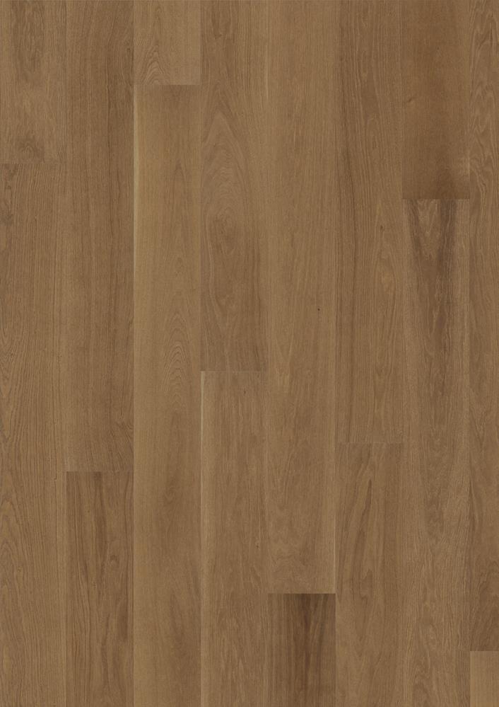 Широкая состаренная доска из дуба, обработанная щеткой и покрыта маслом. Естественные узоры и умеренные вариации оттенков древесины подчеркивают натуральность продукта.