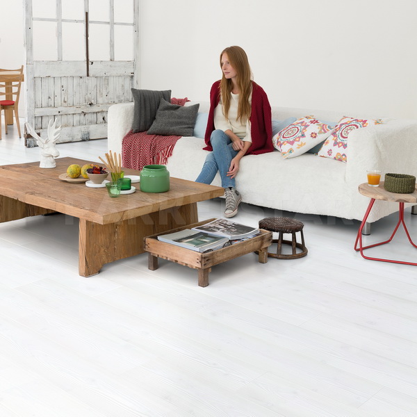 Ламинат Quick-Step Impressive IM 1859 Белоснежный — влагостойкий ламинат 33 класса с эффектом натурального дерева в современном светлом тоне. Благодаря технологии HydroSeal стыки надёжно защищены от влаги до 72 часов, что делает покрытие идеальным для кухни, ванной и прихожей. Поверхность с глубокой текстурой дерева создаёт ощущение настоящего паркета, а светлый цвет визуально расширяет пространство и добавляет интерьеру лёгкости.