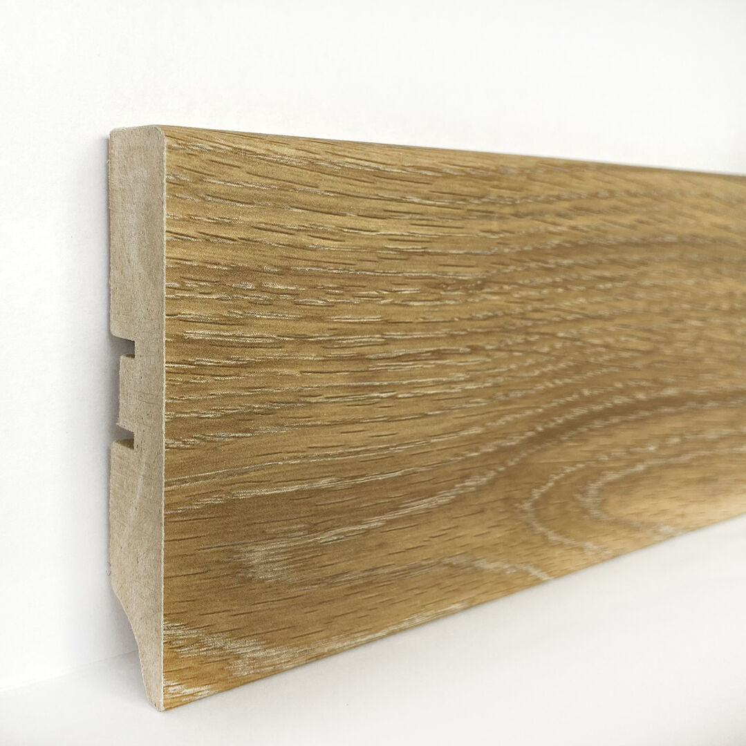 Плинтус выполнен из плиты МДФ и покрыт мебельной финиш-пленкой, которая не требует дополнительной обработки. Пленка защищает плинтус от влаги и загрязнений. Качество и надежность подтверждены европейскими и российскими стандартами производства.